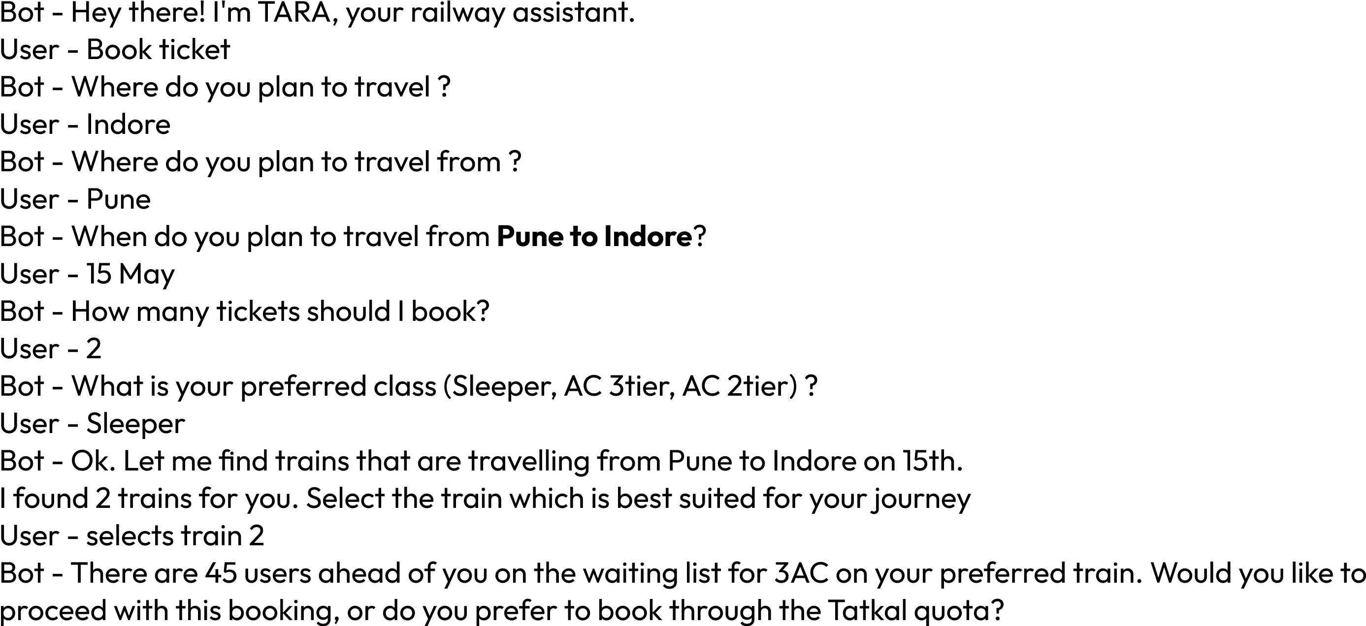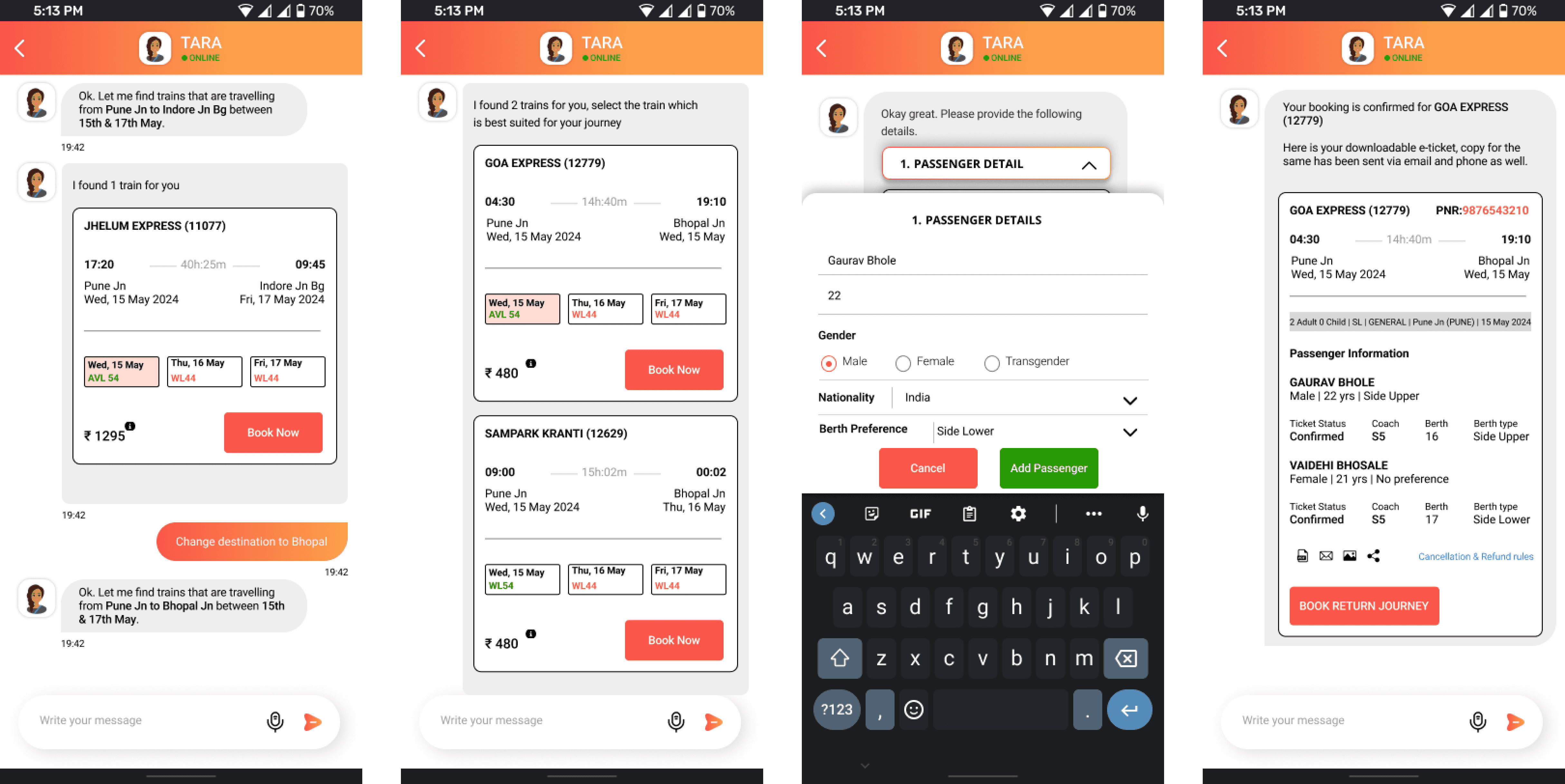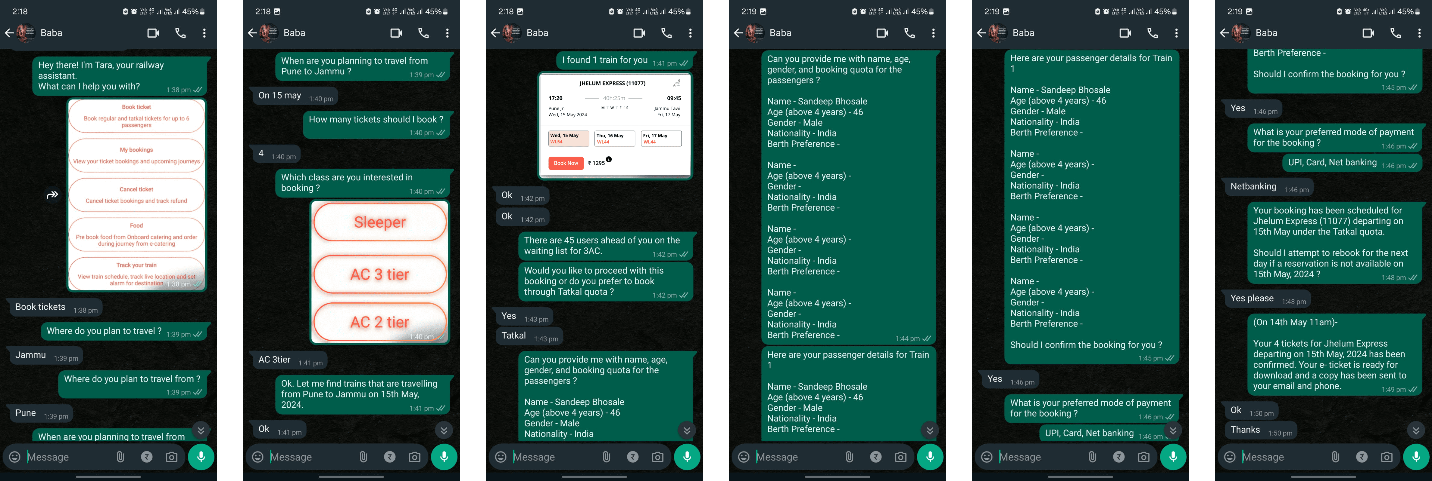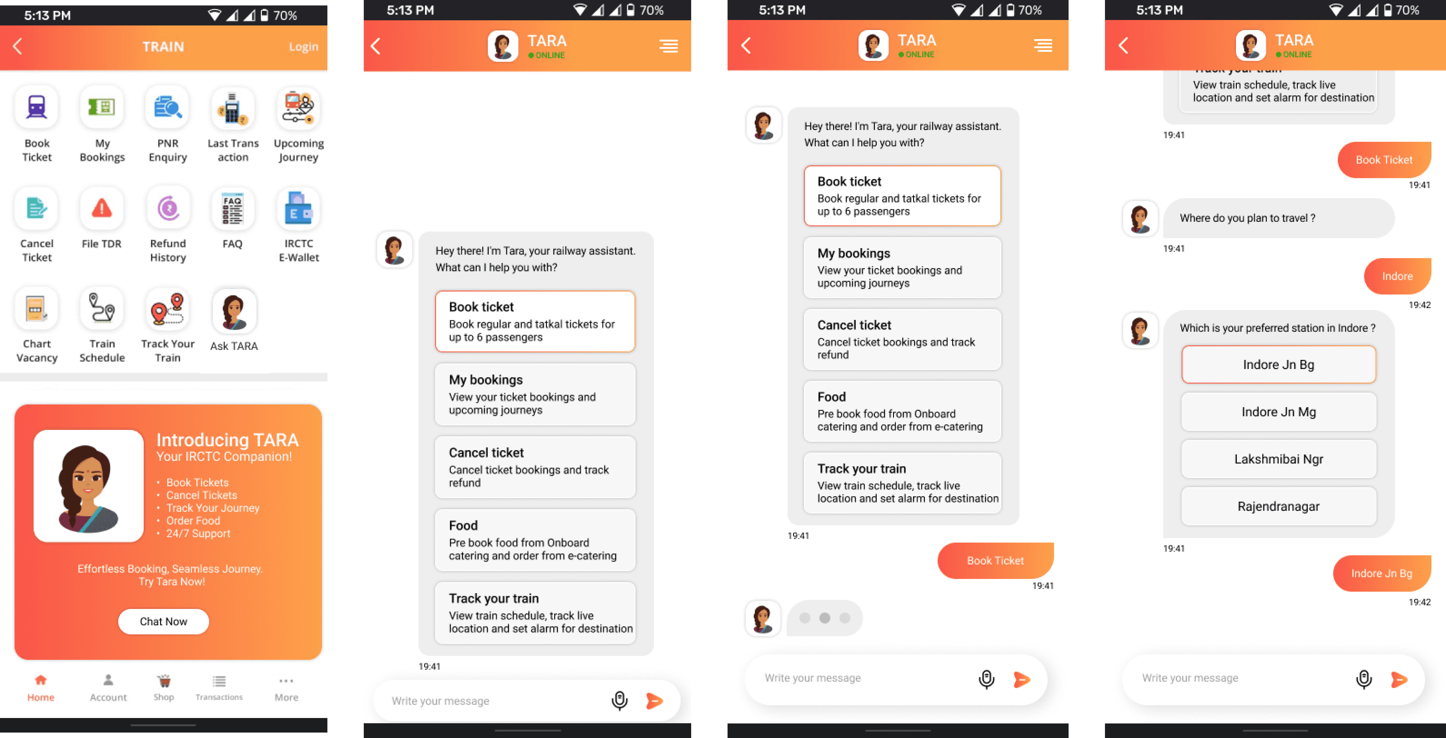 TARA is an AI chatbot that helps passengers find the best train, optimal booking time, and reduces mental load for advance and tatkal bookings.